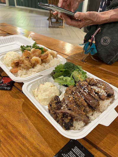 お昼は「サムズ・キッチン」のガーリックシュリンプとステーキ