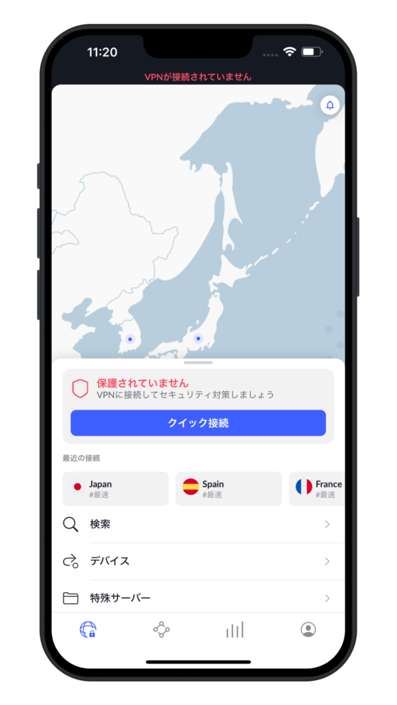 - アプリを開いて「日本」のサーバーを選んで接続